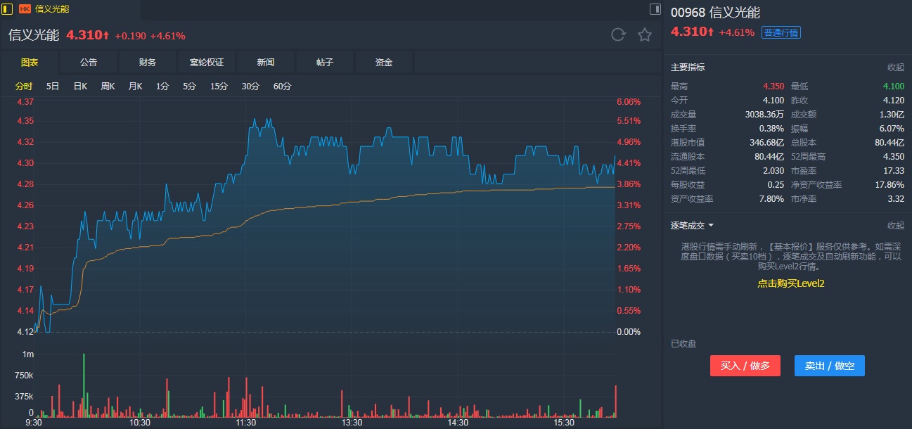 智通财经APP获悉,国泰君安发表报告称,维持信义光能(00968)“增持”评级,目标价4.7港元,市盈率14.62倍。认为光伏平价上网在即,竞争赛道将由“政策驱动”转换成“成本驱动”,需求爆发临界点将至。PERC电池加速替代效应已然彰显,双玻双面组件有望快速渗透,释放光伏玻璃需求红利。信义光能为光伏玻璃龙头,行业机遇期有望优先获益。该行预计预计公司2019-2020年归母净利分别为25.96、30.38亿港元,同增39.32%、17.05%,若考虑公司以旧换新配股3.8亿(将于3月22日前发行),则公司对应每股收益为0.32、0.38港元。