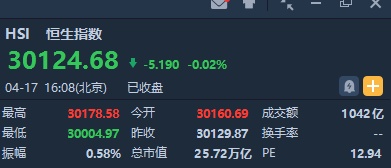 智通财经APP获悉,恒指早盘高开0.1%,全天维持窄幅震荡格局。截至收盘,恒生指数跌5.19点或0.02%,报30124.68点,全日成交额达1042.7亿。国企指数涨0.24%,报点,红筹指数跌0.4%,报4677.85点。