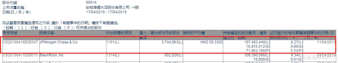 智通财经APP获悉,根据联交所资料显示,摩根大通于4月11日增持海螺水泥(00914)374万股,每股作价50.34港元,总值约1.88亿港元,最新持股数目1.07亿股,最新持股比例为8.27%。