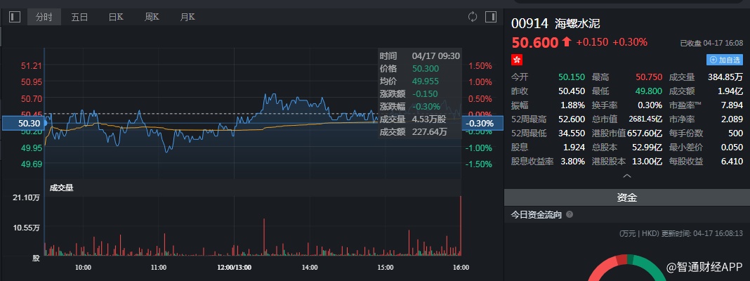 截至今日收盘,海螺水泥(00914)收涨0.30%,报50.60港元。