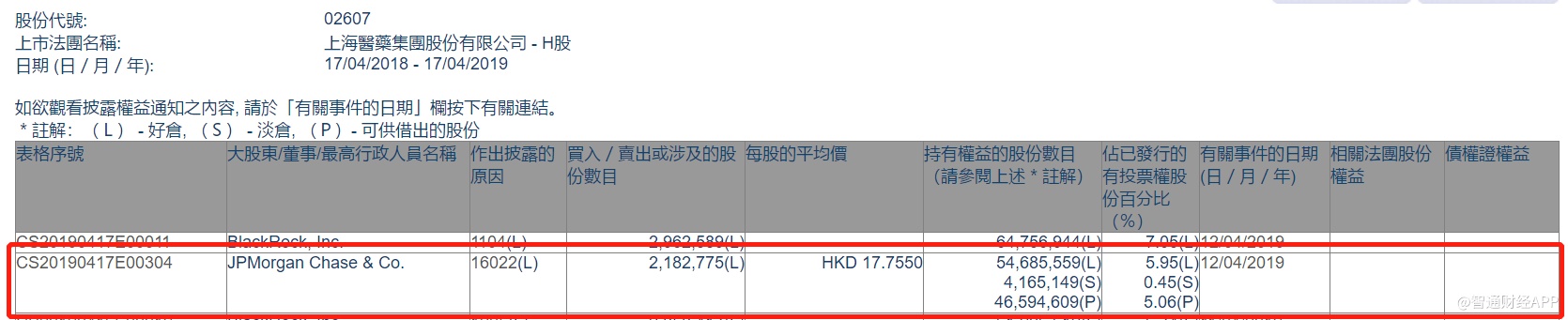 智通财经APP获悉,根据联交所资料显示,摩根大通于4月12日减持上海医药(02607)218万股,每股作价17.75港元,总值约3869.5万港元,最新持股数目约5468.55万股,最新持股比例为5.95%。