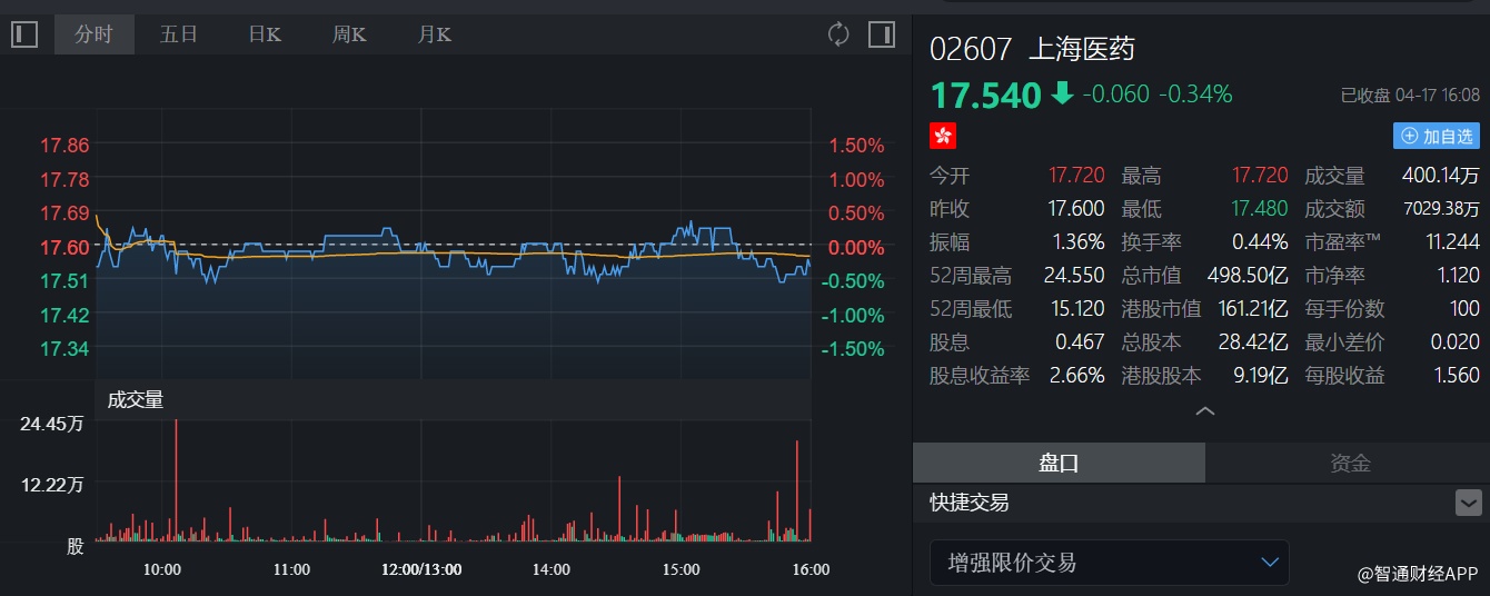 截至今日收盘,上海医药(02607)收跌0.34%,报17.54港元。
