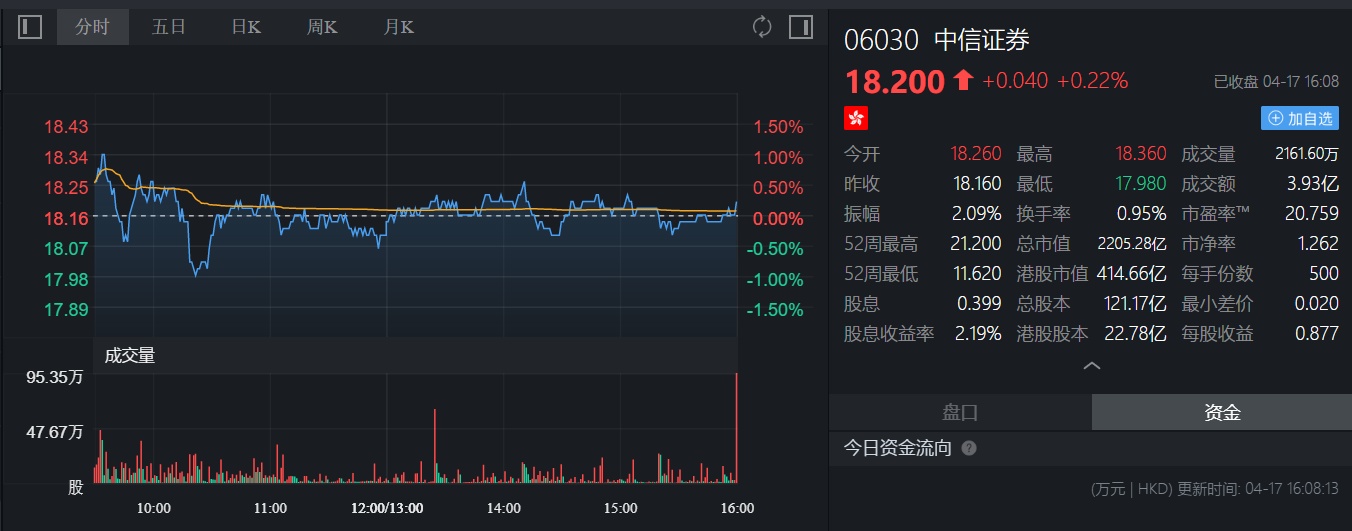 截至今日收盘,中信证券(06030)收涨0.22%,报18.2港元。