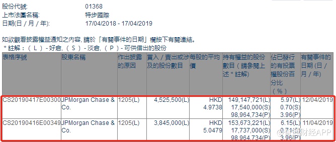 智通财经APP获悉,根据联交所资料显示,摩根大通于4月11日及12日合共减持特步国际(01368)837万股,每股作价分别为5.0479港元和4.9738港元,总值约8388万港元,最新持股数目约1.49亿股。最新持股比例为5.97%。