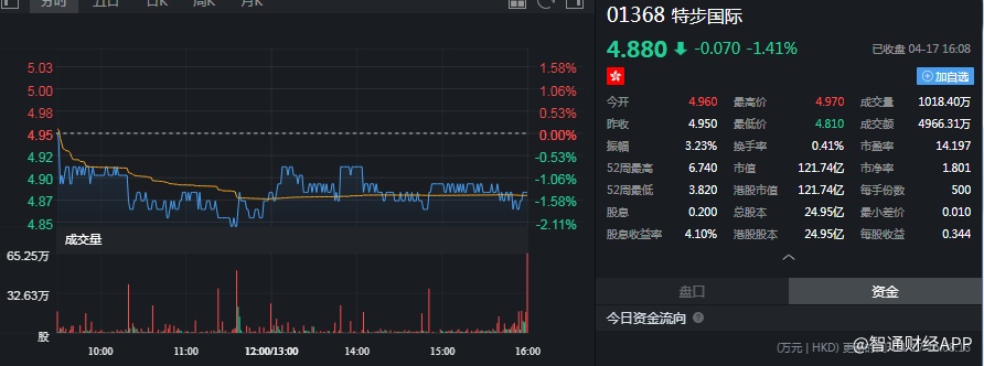 截至今日收盘,特步国际(01368)跌1.41%,报4.88港元。