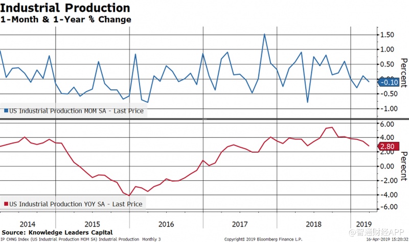 工业生产低于月度预期,下降了0.10%。这使得1年期的变化率下降到2.8%。