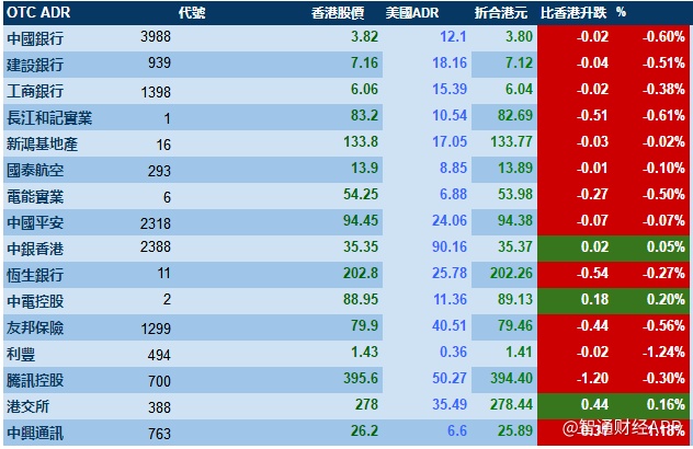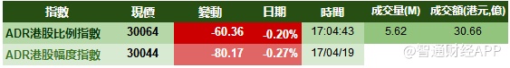 智通财经APP获悉,美股小幅受压,拖累港股ADR指数全日偏软,按比例计算,收报30064点,跌60.36点。汇丰控股收报68.19元,较港收市升0.34元;腾讯控股收报394.4元,较港收市跌1.2元。