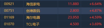 智通财经APP获悉,家电股早盘集体高开,截至9时20分,海信家电(00921)涨6.64%,创维数码(00751)涨4.87%,海尔电器(01169)涨4.59%,TCL电子(01070)涨3.69%。