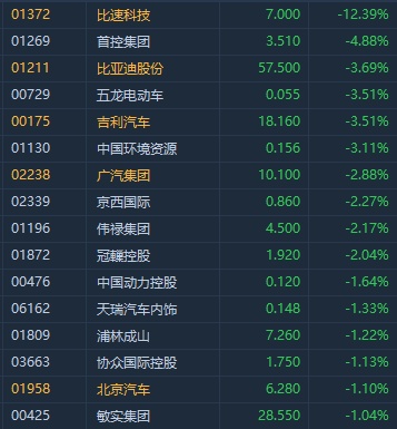 智通财经APP获悉,昨日汽车股的强势走高又沦为一日游行情,早盘集体回调,截至发稿,首控集团(01269)跌4.88%,五龙电动车(00729)跌3.51%,吉利汽车(00175)跌3.51%,北京汽车(01958)跌1.1%。