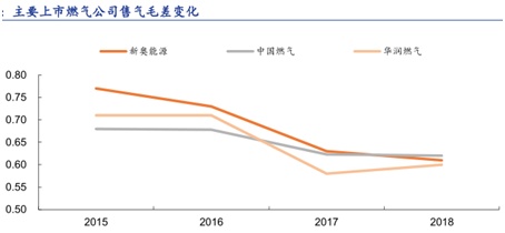 需求增速下滑的同时,燃企售气的利润空间还在下滑。近几年,新奥、中燃、华燃的售气毛差在持续下滑,考虑到实体经济对终端用能成本的让利诉求,以及天然气上游企业不断争夺利润空间来看,燃企售气毛差长期走势依然是向下,由此带来的将是业绩增速持续跑输售气量增速。