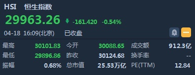 智通财经APP获悉,恒指早盘低开0.12%,报30088.65点,盘中失守三万点大关。截至收盘,恒生指数跌161.42点或0.54%,报29963.26点,全日成交额达912.37亿。国企指数跌0.68%,报11768.63点,红筹指数跌0.44%,报4657.41点。