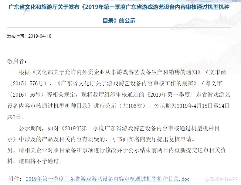 智通财经APP获悉,今日,广东省文化和旅游团发布了《2019年第一季度广东省游戏游艺设备内容审核通过机型机种目录》。目录显示,腾讯(00700)科技代理任天堂的“Nintendo Switch 游戏机”已通过广东省文化厅审批,目前尚在公示期。