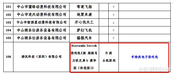 审批信息中还出现了《新 超级马力欧兄弟U 豪华版(体验版)》的字样,意味着该游戏很可能成为国行版Nintendo Switch的首发游戏之一。这也是106个过审游戏中唯一一个B类主机游戏,备注说明是手持类电子游戏机。