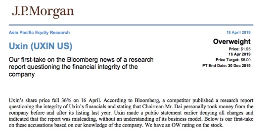智通财经APP获悉,近日,J Capital Research(美奇金投资)发布了针对国内二手车电商第一股优信集团(UXIN.US)的做空报告。做空报告发布后,优信集团股价大幅异动。美国当地时间4月18日,全球知名投行摩根大通(J.P.Morgan)也发布了针对此事的分析报告,对做空报告中交易量数据情况、车源量数据情况、创始人戴琨是否套现及优信未来前景四方面逐一作出了反驳。