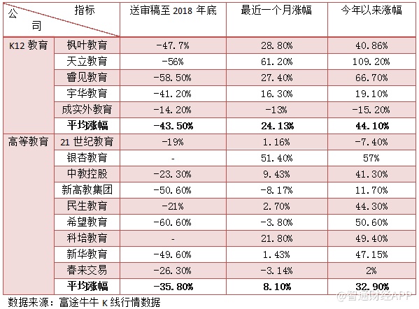 2019年初至今反弹幅度前三的K12个股分别是天立教育(01773)、睿见教育(06068)和枫叶教育(01317),分别涨幅109.2%、66.7%和40.86%;反弹幅度前三的高教个股分别是希望教育(01765)、科培教育(01890)及新华教育(02779),分别涨幅50.6%、49.4%、47.15%以及44.3%。