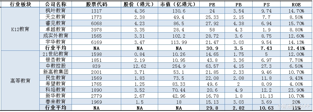 这就要谈到各大教育股估值便不便宜的问题了,未来的“雷”未点燃,估值若在底部,跌无可跌,仍可有投资机会,若已经在高位,投资的风险就会很大。智通财经对K12及高教各大参与者在PE、PB以及PS的估值进行了整理列表。
