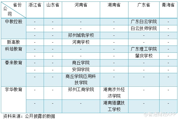 智通财经整理了入选省份分布的港股高教公司,中教控股有三家学校、新高教有一家、科培教育有两家、春来教育有三家以及宇华教育有三家。以下为入选省份高教公司分布情况: