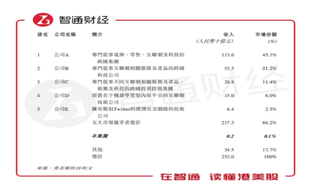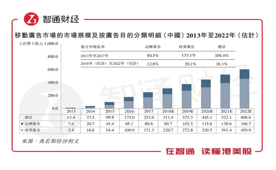 展望未来,移动广告所有四个主要类别:动态消息广告、应用程序商店广告、搜索引擎广告及视频网站广告,预期将于201 8年至2022年期间持续增长,分别达致1790亿元、646亿元、556亿元及541亿元,复合年增长率分别为23.5%、21.0%、15.6%及31.4%。