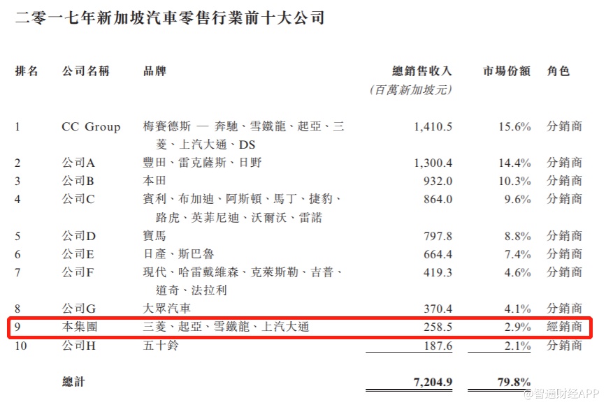 2018年,该公司分别占新加坡新登记三菱乘用车、起亚乘用车及上汽大通乘用车新型号总销售额约31.7%、26.9%及91.7%。同期,占新加坡新登记新型三菱客货车、起亚商用车及雪铁龙商用车销售额约90.2%、98.1%及98.1%。