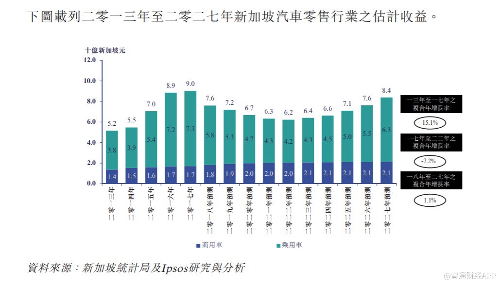 销量停滞不前,令汽车零售行业规模也保持平稳,招股书提到,预计2018-2027年期间,新加坡汽车零售行业的估计收益复合年增长率仅约1.1.%,2027年预估收益约84亿新加坡元,其中商用车零售收益复合年增速略高于乘用车,增长主要由汽车单价上升推动。