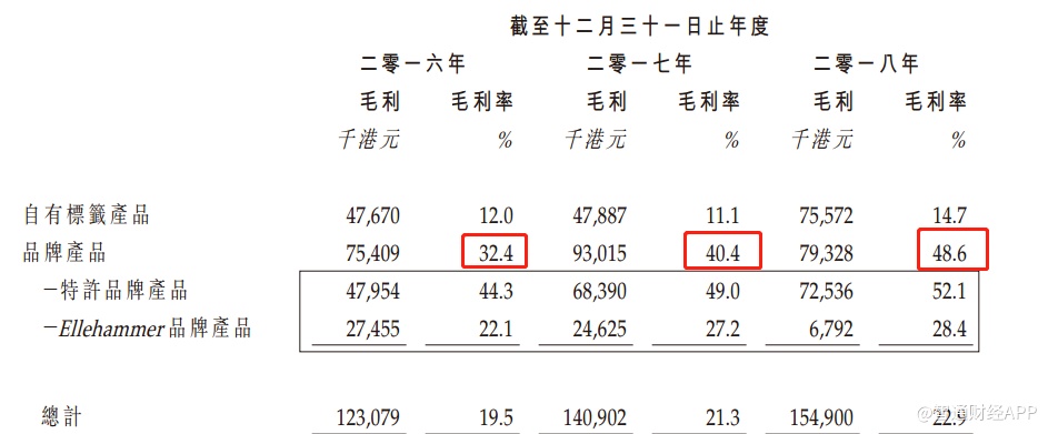 但细看自有品牌和特许品牌的毛利率能发现,二者的毛利率都是逐渐增长的。自有品牌的毛利率从2016年的22.1%增至2018年的28.4%,同期内,特许品牌的毛利率则从44.3%上升至52.1%,这导致品牌产品的毛利率从2016年的32.4%上升至2018年的48.6%,提升16.2个百分点。