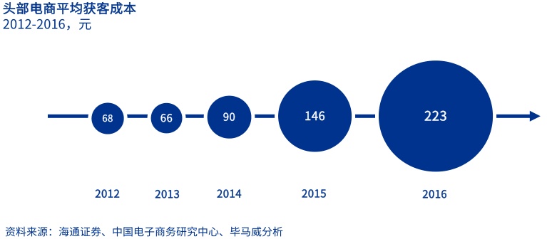 以电商平台为例,近年来,主流头部电商平台的线上新增活跃用户营销成本逐年升高,其中2015至2016年是关键临界点,平均线上获客成本突破200元,已超过线下获客成本。数据显示,2018年,阿里巴巴的获客成本约241元;电商新秀拼多多在2018年的获客成本也达到102元。