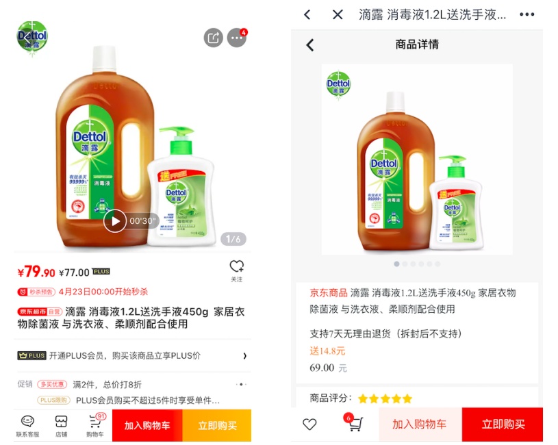 以购买频率较高的日常用品消毒液为例,如下图所示,在京东上购买1.2L滴露消毒液(送450g洗手液)的费用一共79.9元人民币(左图),而在“彩惠人生”上购买价格为69元人民币,并且赠送14.8元的抵扣金(右图)。