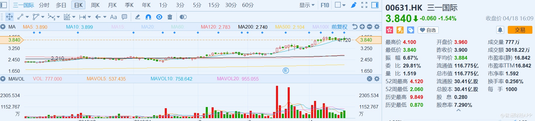 今年一季度季的业绩是在去年同期高基数的基础上取得的,整体延续了去年的强劲势头。在煤价高企的驱动下,煤炭企业对煤机设备需求大幅提升,加上铁路集装箱运输快速发展,2018年全年三一国际取得收入44.17亿元,同比增长约78%。股东应占溢利为6.00亿元,同比上升1.62倍。公司同时宣布每股派发10港仙股息,为6年来首次。