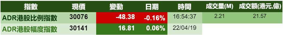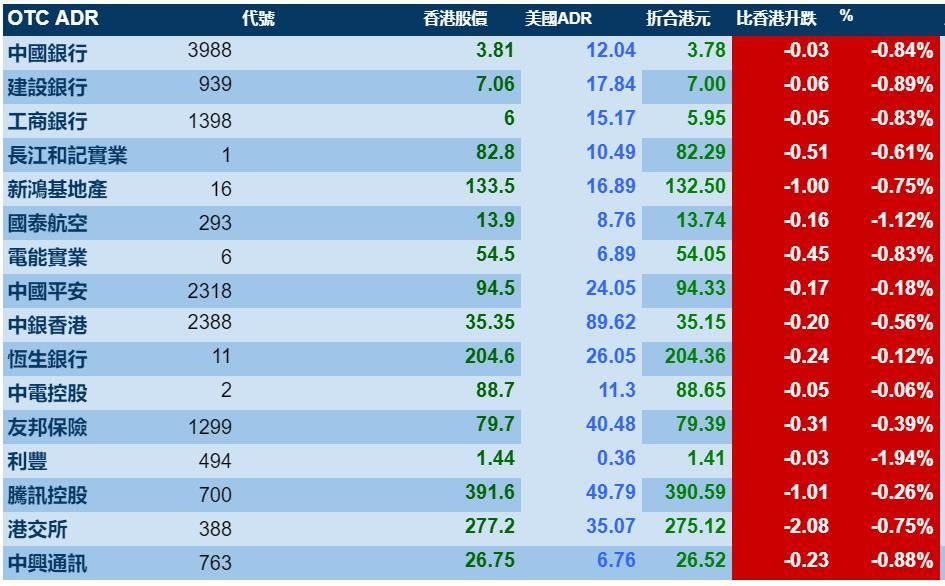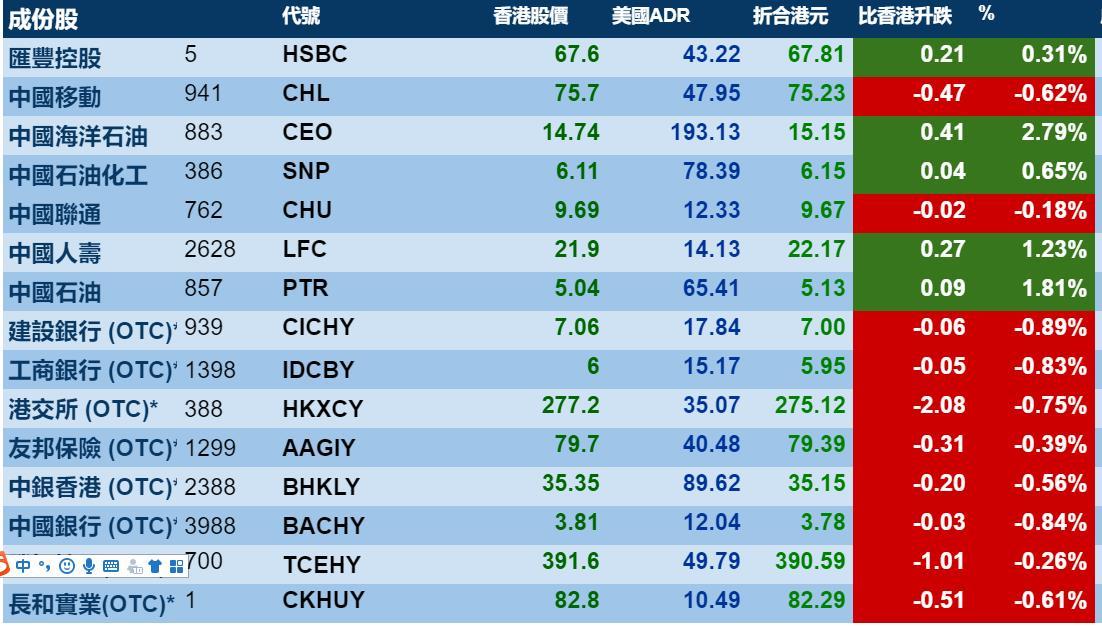 智通财经APP获悉,美股涨跌不一,港股ADR指数则开始走弱,按比例计算,收报30076点,跌48.38点。大型蓝筹全线走弱,汇丰控股收报67.81元,较港收市跌0.21元;腾讯控股收报390.59元,较港收市跌1.01元。