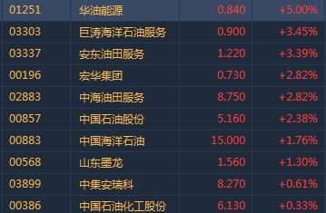 智通财经APP获悉,受国际油价大幅上涨影响,港股石油股早盘全线高开。截至9时34分,华油能源(01251)涨5%,安东油田(03337)涨3.39%,中海油服(02883)涨2.82%,中石油(00857)涨2.38%,中海油(00883)涨1.76%。