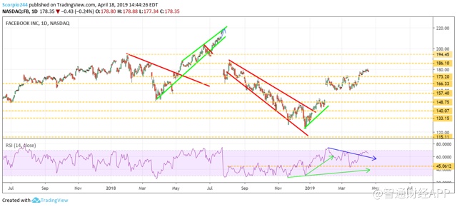 下图还显示,Facebook的股价可能会继续上涨,在186美元的高位可能会遇到阻力。此外,相对强弱指数继续上升,显示该股看涨势头。