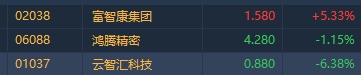 智通财经APP获悉,郭台铭概念股临近午间收盘集体拉升,富智康(02038)止跌回升涨5.33%,鸿腾精密(06088)、云智汇科技(01037)跌幅有所收窄。