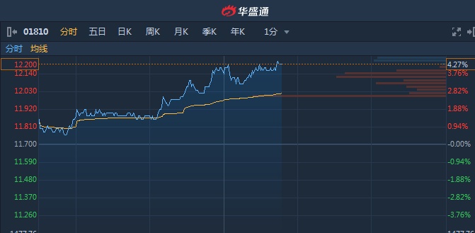 智通财经APP获悉,小米集团(01810)多重利好叠加刺激股价上涨。截至13时46分,涨4.1%,报价12.18港元,成交额16.44亿。