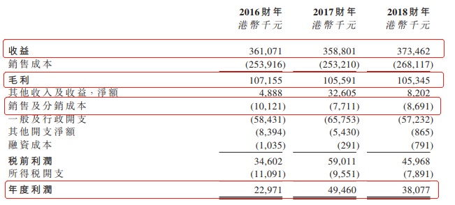 截至2016年、2017年以及2018年,该公司取得的收益分別为3.61亿港元、3.59亿港元以及3.73亿港元;销售成本分別为2.54亿港元、2.53亿港元以及2.68亿港元;衣物护理电器销售的收益相当于对应期间总收益的65.0%、57.7%及45.9%。调整后年度净利润分別为2944.5万港元、2820.6万港元以及3814.2万港元。