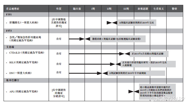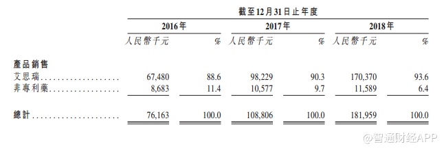 公司的艾思瑞吡非尼酮胶囊,在2011年9月获得国家食品药品监督管理局颁发的1.1类新药证书,并于2014年2月底正式上市销售,是我国第一个治疗肺纤维化的药物。艾思瑞是公司的主要收入来源,2016年至2018年度,艾思瑞分别占公司收入的88.6%、90.3%及93.6%。