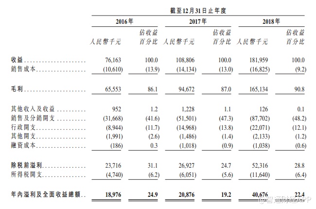 招股书显示,2016年至2018年,康蒂尼分别实现收益为7616.30万元、1.09亿元、1.82亿元;毛利分别为6555.3万元、9467.2万元及1.65亿元,毛利率分别为86.1%、87.0%及90.8%;年内溢利及全面收益总额分别是1897.60万元、2087.60万元、4067.60万元。