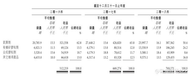 收益由截至2016年12月31日止年度约人民币5.12亿元增加约30.7%至截至2017年12月31日止年度约人民币6.69亿元,进一步增加约14.9%至截至2018年12月31日止年度约人民币7.69亿元。其原因主要是经销商数目由2017年12月31日的924名增加至2018年12月31日的1022名。此外,销售有机矽胶粘剂的收益部分增加约131.3%,此乃由于三和精化于2018年4月收购三和控股,该公司主要从事生产及出售有机矽胶粘剂。