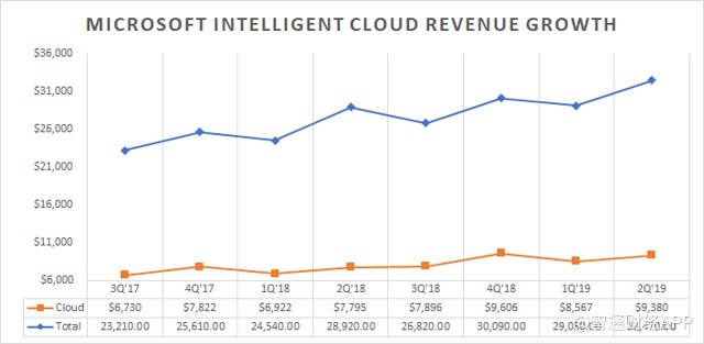 近年来,微软的云业务一直是该股增长的重要驱动力。自2017年第三财季以来,该业务已稳定在每个季度总收入的30%左右。自2018年第三季度以来,它为微软带来了约35%至40%的同比收入增长。而在2019年第二财政季度中,云业务增长到约94亿美元,约占微软总收入的29%。