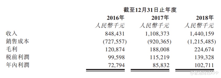 该公司取得可持续增长的稳定往绩记录。其收入由截至2016年12月31日止年度的约848.4百万元增加至截至2017年12月31日止年度的约1108.4百万元,并进一步增加至截至2018年12月31日止年度的约1440.2百万元,复合年增长率约为30.3%。