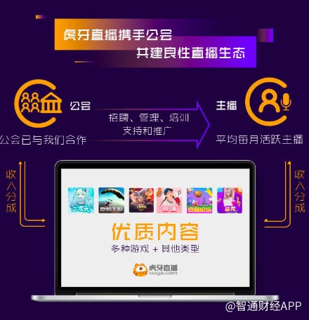 与斗鱼注重头部主播并倾向于个人签约不同,虎牙的模式是“平台—公会—主播”。这一模式为虎牙省下了一大笔开支。