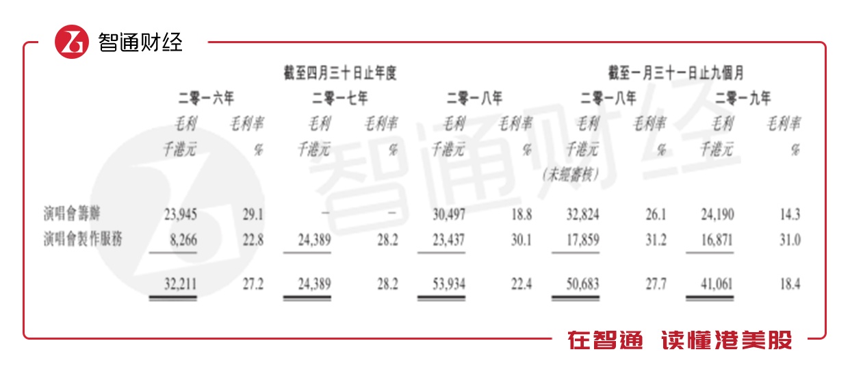 据艺能环球招股书数据,其演唱会筹办业务的毛利率在过去三年不断下滑。对此,艺能环球在招股书中解释为,因执行过程中产生的舞台开支及运营成本超出预算成本,导致了两场表演获得了边际亏损。此外,因门票销售收入低于预期也导致了七场表演产生了亏损。