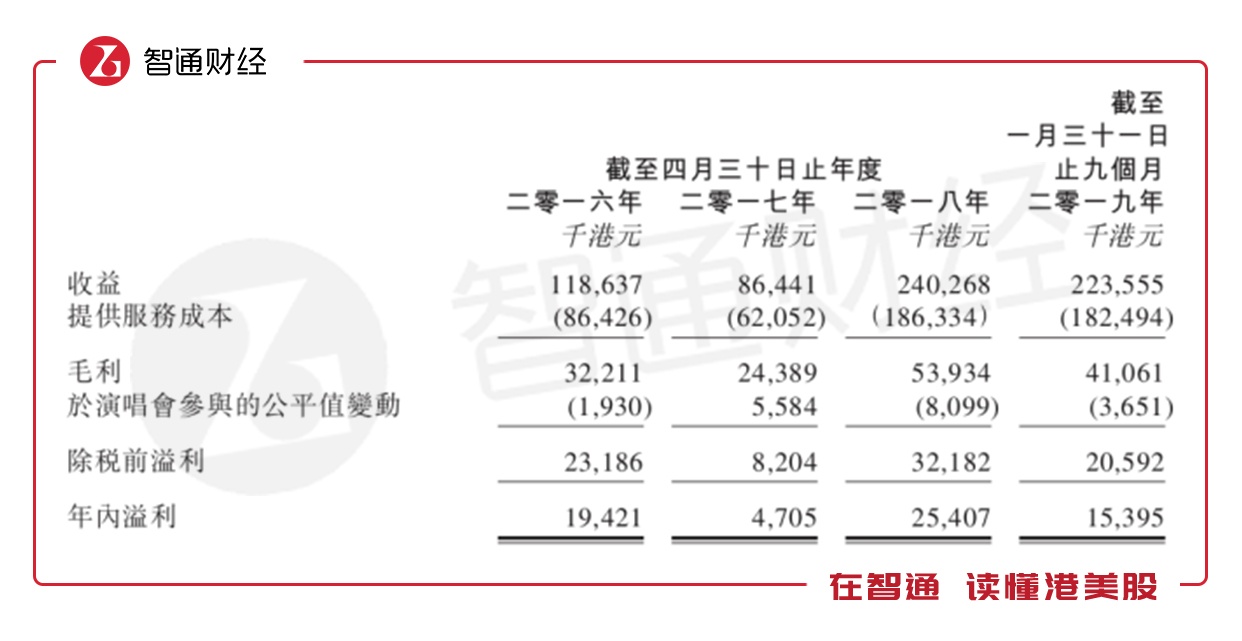 可以看出,演唱会业务的风险较大,除了现场突发状况及门票收入无法把控外,艺能环球也不能让演唱会举办的数量维持稳定,比如其在2017年没有举办任何演唱会,相关业务收入也为零。
