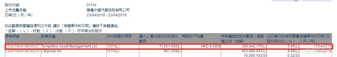 智通财经APP获悉,根据联交所资料显示,邓普顿资产管理于4月17日减持华晨中国(01114)1156万股,每股作价9.095港元,总值约1.05亿港元,最新持股数目约3亿股,最新持股比例为5.96%。