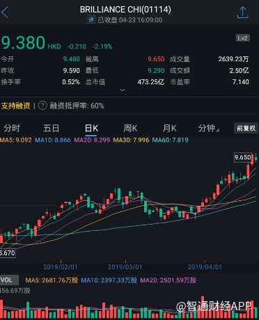 截至今日收盘,华晨中国(01114)收跌2.19%,报9.38港元。