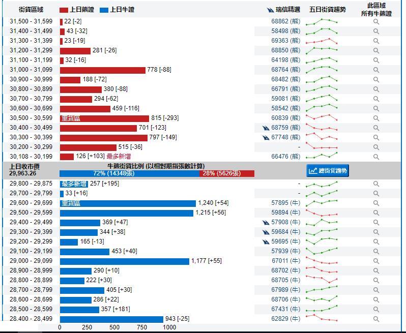 智通财经APP获悉,截至4月23日,恒指最新的牛熊街货比例72:28。从瑞信恒指牛熊证街货分布图中得到的数据显示,熊证街货重货区在30500-30599区间,该区间最新熊证数量为815张,较上一交易日减少293张;最多新增区间在30108-30199区间。牛证街货重货区在29600-29699区间,该区间最新牛证数量为1240张,比上一交易日增加54张;最多新增区间在29600-29699区间。
