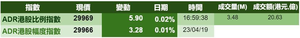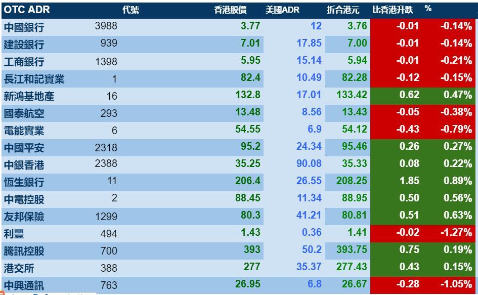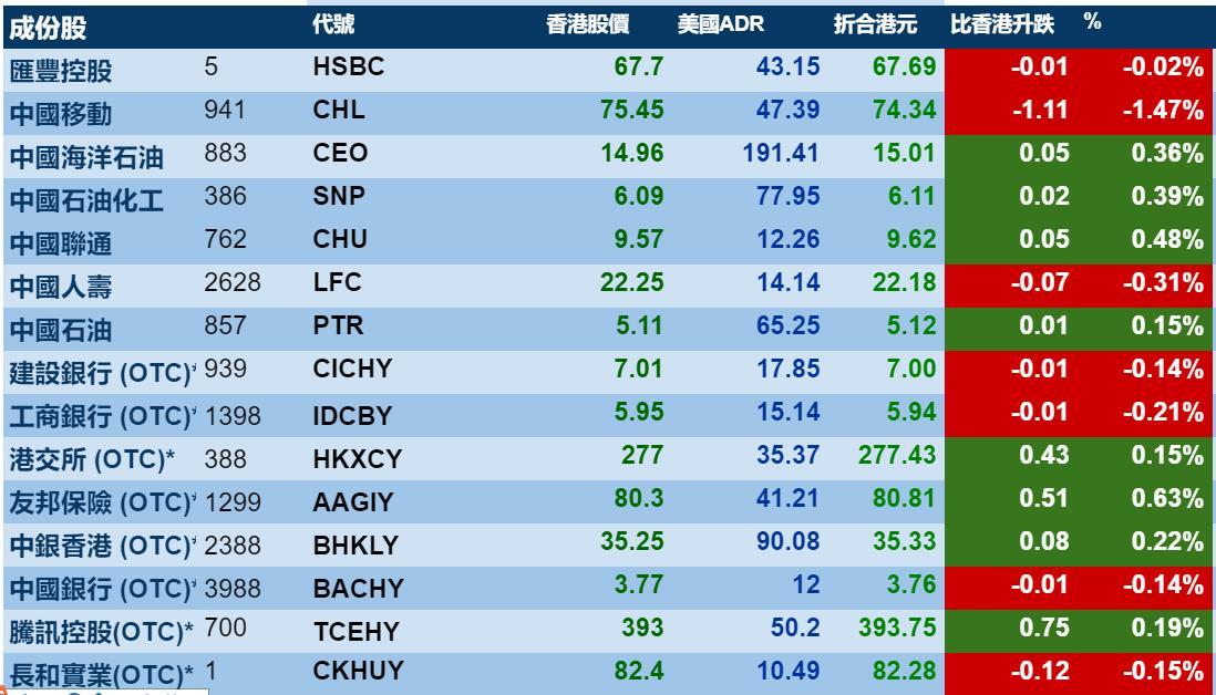 智通财经APP获悉,美股上扬,港股ADR指数也紧随其后,小幅上涨,按比例计算,收报29969点,升5.90点。大型蓝筹涨跌不一,汇丰控股收报67.69元,较港收市跌0.01元;腾讯控股收报393.75元,较港收市跌0.75元。