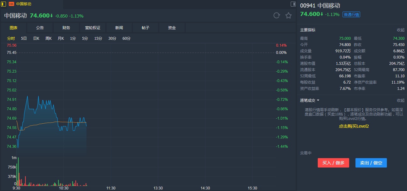高盛称,中移动首季纯利连跌9个季度,不纳入IFRS 16 会计准则改变,首季纯利为239亿元人民币,同比跌7.3%,只及高盛2019年全年预测的21.9%,而首季收入及EBITDA各为1850亿元人民币及665亿元人民币,同比各跌0.3%及4.6%,只达到高盛2019年全年预测的23.8%及23.1%。