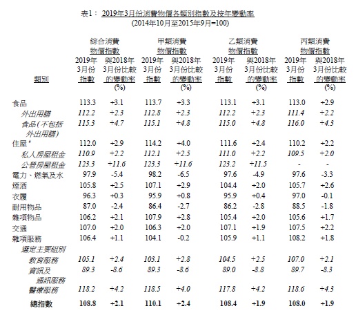 在各类综合消费物价指数组成项目中,价格在2019年3月份取得按年升幅的类别为食品(不包括外出用膳)(上升4.7%)、住屋(上升2.9%)、烟酒(上升2.5%)、外出用膳(上升2.3%)、杂项物品(上升2.1%)、交通(上升2.0%)、杂项服务(上升1.1%)和衣履(上升0.3%)。