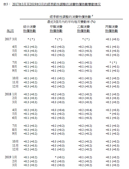 经季节性调整的甲类、乙类及丙类消费物价指数,截至2019年3月止的3个月的平均每月升幅分别为0.2%、0.2%及0.1%,与截至2019年2月止的3个月的相应变动率相同。剔除所有香港政府一次性纾困措施的影响,截至2019年3月止的3个月,经季节性调整的甲类、乙类及丙类消费物价指数的平均每月升幅分别为0.3%、0.2%及0.2%,与截至2019年2月止的3个月的相应升幅相同。