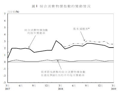 截至2019年3月止的12个月,综合消费物价指数较一年前同期平均上升2.3%,甲类、乙类及丙类消费物价指数的相应升幅则分别为2.7%、2.2%及2.1%。剔除所有香港政府一次性纾困措施的影响,相应升幅则分别为2.7%、3.1%、2.6%及2.4%。